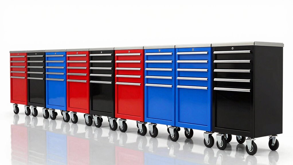 Organizational accessories play a crucial role in maximizing the efficiency of your rolling tool cabinet. Drawer dividers, liners, and pegboards help keep tools separated and easily accessible, saving you time. Adjustable or removable shelves and compartments let you customize the interior to fit different tool sizes and types, ensuring a perfect fit. Labeling systems on drawers or compartments make identifying contents quick and simple, boosting workflow. Tool-hanging attachments like hooks or perforated panels provide organized storage for small hand tools and accessories. Compatibility with optional dividers or modular inserts allows for tailored organization solutions to meet your specific workshop needs. These accessories not only improve organization but also make your workspace more efficient and adaptable.
