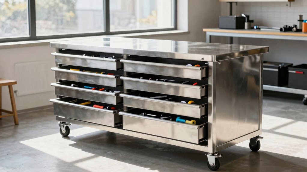 Think of a rolling workbench as the sturdy ship that carries your tools through every project storm. With the right drawers and features, it becomes your reliable anchor amidst the chaos. Choosing wisely guarantees you’re sailing smoothly, with everything at your fingertips and nothing lost to the waves. So, pick the one that feels like home port—ready to anchor your creativity and craftsmanship, no matter where your work takes you.