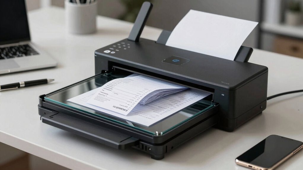 While connectivity options keep your scanning process flexible and secure, image quality plays an essential role in guaranteeing your digital copies are clear and usable. Higher resolution settings, like 600dpi or above, provide sharper, more detailed images of receipts and documents, making text more legible. Automatic image enhancement features such as color correction, background removal, and contrast adjustment further improve clarity and readability. If you plan to use OCR, high image quality is vital for accurate text extraction. Proper lighting and minimal shadows during scanning also help maintain sharpness. Additionally, the optical quality, including premium lenses and sensors, directly impacts the crispness and precision of your scans. Prioritizing these factors ensures your digital copies are clear, accurate, and professional-looking.