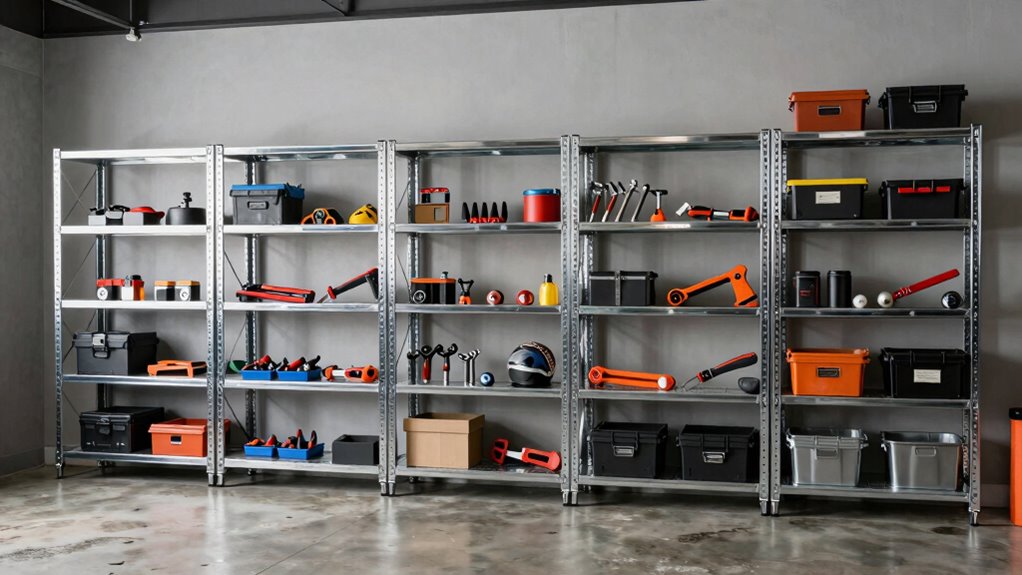 After figuring out the best dimensions for your steel garage shelving, the next big consideration is adjustable shelf features. I love how adjustable shelves let me customize heights for different items, making my storage more efficient. Many units have simple mechanisms for quick adjustments in 1-inch or 1.5-inch increments, which is super convenient. Plus, locking pins keep everything secure, preventing accidental shifts while I’m working. Some units even allow splitting the entire shelving into separate sections, giving me added flexibility in organizing my space. This adaptability means I can easily store tall equipment alongside smaller tools, creating a tidy and organized garage. With adjustable shelves, I can maximize every inch of my garage effectively.