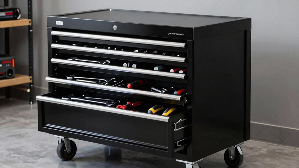 Security features are a critical aspect to take into account because they directly impact the safety and integrity of your tools. Locking mechanisms prevent theft and unauthorized access, guaranteeing your valuable equipment stays secure. Lockable drawers also help prevent accidental tool usage by children or untrained personnel, adding an extra layer of safety. For professional environments, reinforced locks that resist tampering provide enhanced protection against theft and vandalism. Electronic or digital lock options offer advanced security, allowing you to track access history and control who can open the cabinet. High-quality security features not only protect your tools but also contribute to maintaining an organized, safe workspace. Investing in a cabinet with robust security ensures your tools remain safe and readily available when needed.