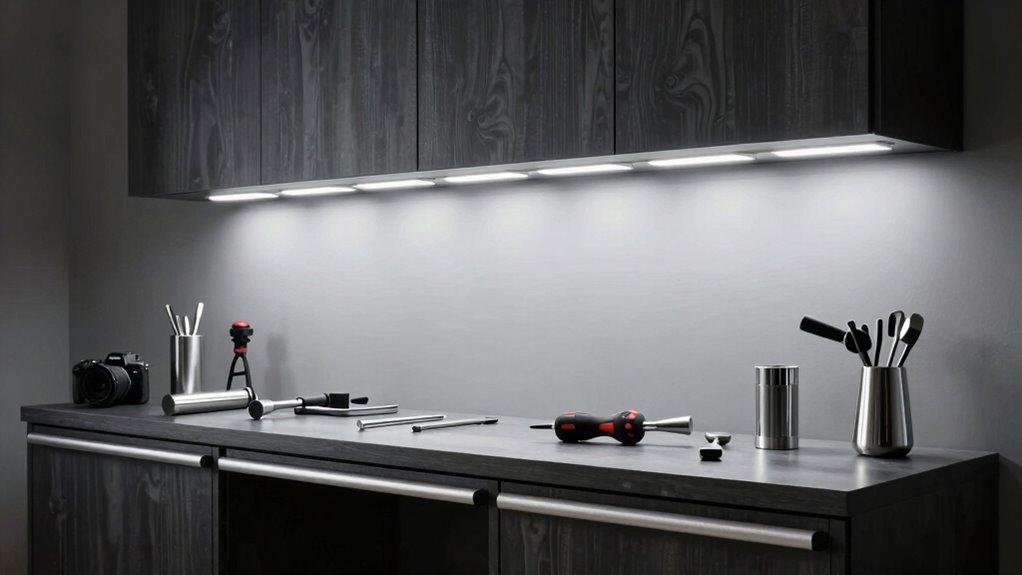 To install under cabinet lights in your garage workspace, I start by turning off the power. Then, I measure and mark where I want the lights, usually under the cabinets. I drill small holes for mounting brackets, connect the wiring following the instructions, and secure the fixtures. Finally, I turn the power back on and test the lights to guarantee everything works smoothly.