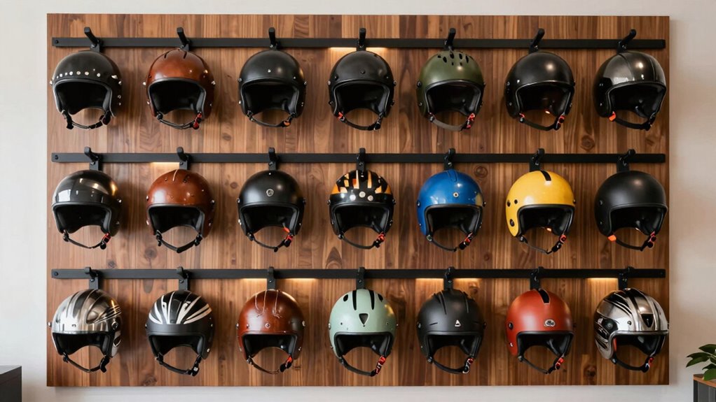 Choosing a wall-mounted helmet rack requires making sure it can handle a variety of helmet types and sizes, since not all helmets are created equal. I look for racks with adjustable or multiple hooks and platforms to support different gear like motorcycle, bicycle, ski, and sports helmets. Durability matters too—fragile visors or soft padding need protection from the rack’s material. I also check if the rack is compatible with my wall type, whether drywall, concrete, or wood, to guarantee a secure hold for different helmet weights. Additional storage options for gloves, keys, or jackets are a bonus, boosting versatility. A rack that adapts to various helmet styles and accessories simplifies organization and ensures everything stays safe and accessible, no matter the gear I need to store.