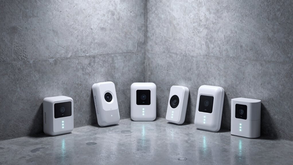 Choosing the right water leak detector for your basement starts with careful consideration of installation and placement. I look for devices that are easy to set up without wiring or complicated steps, especially since basements can be tricky to work in. Placement is key—I prefer detectors near sump pumps, water heaters, or appliances prone to leaks, ensuring I cover the most vulnerable spots. It’s also important that the detector is waterproof or water-resistant, with ratings like IP66 or IP67, so it withstands humidity and accidental water contact. Size and shape matter, too—I want something discreet that fits into tight spaces or hidden corners. Finally, I choose detectors with reliable alerts, whether loud alarms or remote notifications, so I’m always promptly informed of a leak.