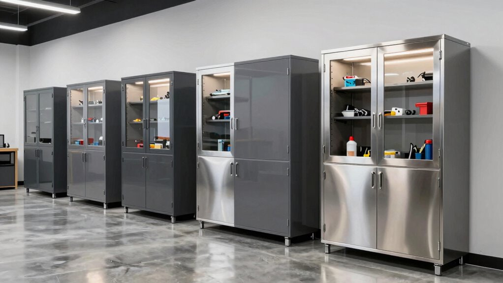 Flexibility and customization are essential factors when selecting a workshop storage cabinet system because they guarantee the setup can adapt to changing needs and maximize space efficiency. Adjustable shelves that support up to 150 pounds let me store a variety of tools and equipment securely. Modular units and movable cabinets allow me to tailor the layout, making the most of available space and adjusting as my workshop evolves. Compatibility with accessories like hooks, bins, and pegboards enhances organization, accommodating small items and tools with ease. Lockable cabinets and drawers provide added security for valuable or hazardous items. The ability to reconfigure or expand the system over time ensures my storage remains efficient and organized, even as my workshop requirements change.